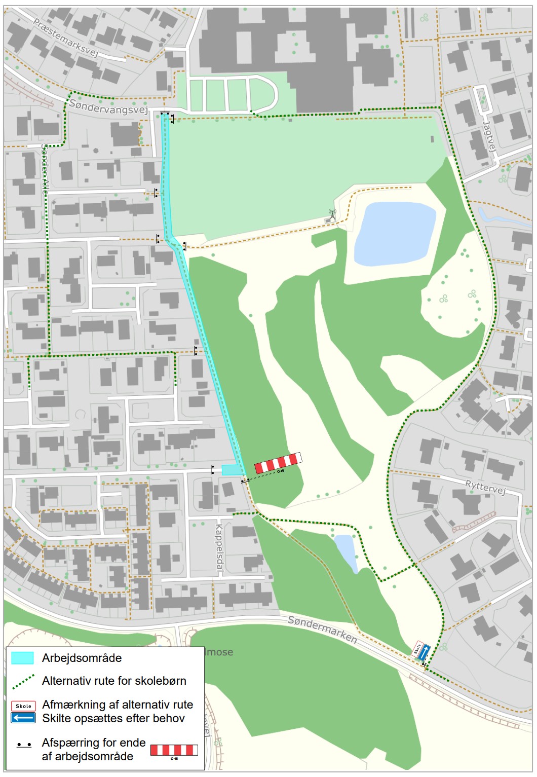 Vi har lavet en plan, der viser arbejdsområde, alternativ rute for skolebørn, afspærring ved enden af arbejdsområdet, afmærkning af alternativ rute med skilte efter behov